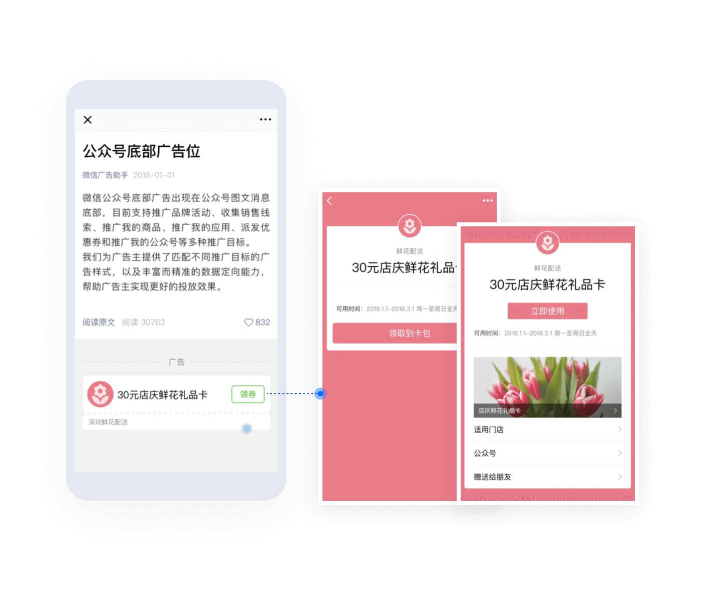 您可以推廣微信卡券,將優(yōu)惠信息快速大規模的觸達至目標用戶(hù),引導用戶(hù)線(xiàn)下到店消費,并可以利用卡券核銷(xiāo)數據進(jìn)一步進(jìn)行用戶(hù)分析。